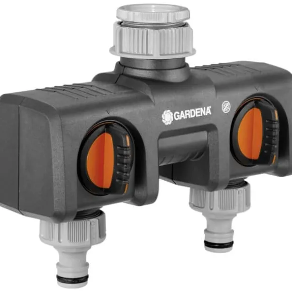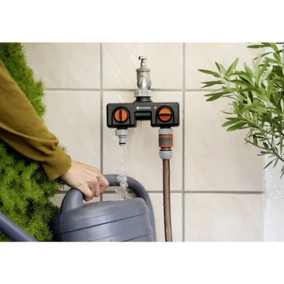 För drift av 2 tillbehörsenheter. Vattengenomflöde reglerings- och låsbart. Passar till 2 GARDENA bevattningsdator eller bevattningsklockor. Kan göras till GARDENA Proffs-system med proffssystemskran. För 26,5 mm (G 3/4)-vattenkran med 30,3 mm (G 1)-gänga och för 21 mm (G 1/2)-vattenkran med 24,2 mm (G 3/4)-gänga.