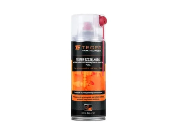 Gas- och tryckluftssystem läckagetestare – Skum, 400 ml, TEGER. Professionell serviceagent för exakt lokalisering av läckor i gassystem (LPG, CNG, propan, butan, etc.) och trycksatta tryckluftssystem. Produkten innehåller en speciell substans som täcker systemkomponenter med en enhetlig massa. Vid läckage uppstår karakteristiska bubblor på massan. Säker för de flesta material, inklusive metaller, plaster och gummi. Bildar inte farliga föreningar med koldioxid, propan, butan, acetylen, syre, natur- och stadsgas, kväve och kväveoxid. Ej korrosiv och lätt att använda – applicera helt enkelt skummet på anslutningarna som testas och observera reaktionen. Användningsanvisning: Skaka ordentligt före användning, spraya sedan den testade systemkomponenten med hjälp av det medföljande röret från ett avstånd av 3-4 cm. Om systemet läcker kommer karakteristiska bubblor att dyka upp. Produkten kräver ingen förrengöring. Det kräver inte sköljning från den testade ytan. Det reagerar inte med metall. Produkten kan användas i vilken position som helst. Avfallshantering: Kassera behållaren i lämpligt märkta behållare i enlighet med nationella bestämmelser.