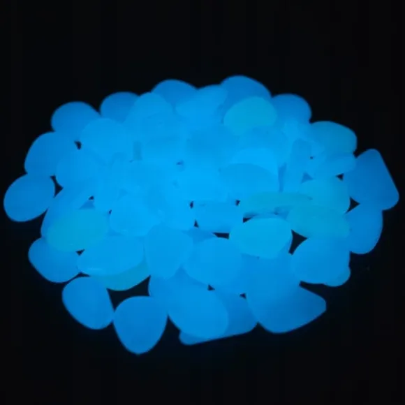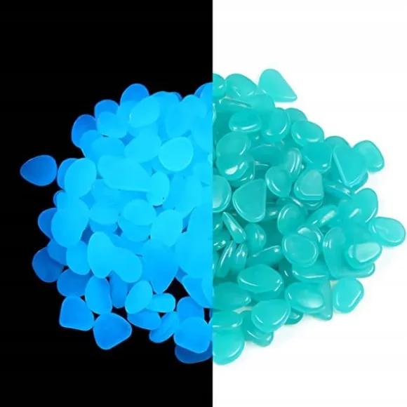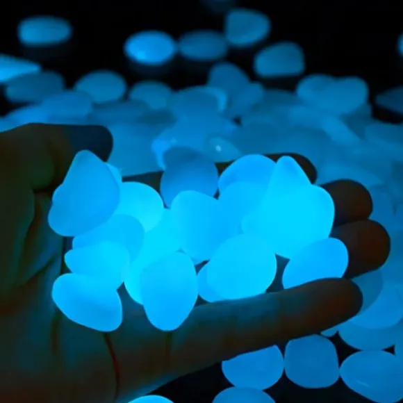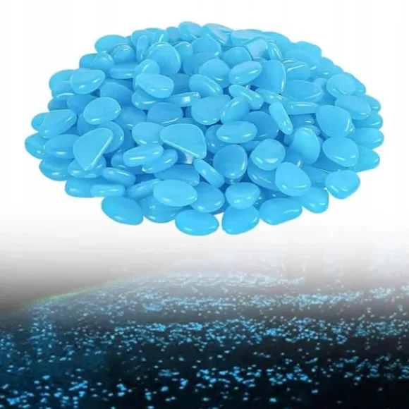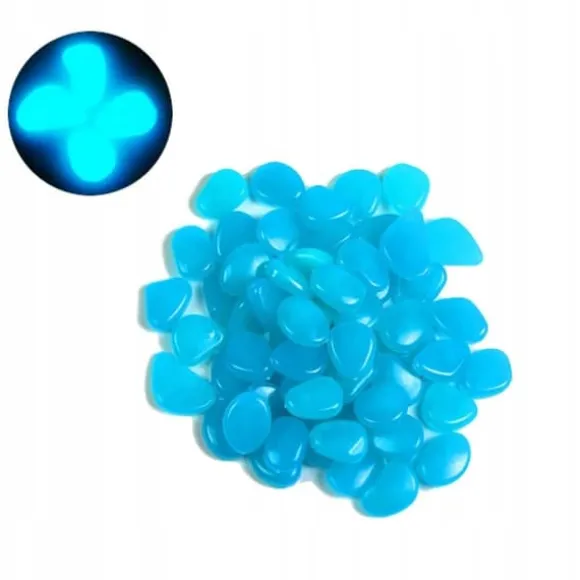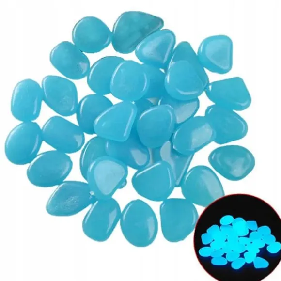 En uppsättning med 50 småsten som lyser blått efter exponering för ljus. Småstenarna är rundade så att de inte orsakar skärsår. De är idealiska för gångar, trottoarer, men även för blomkrukor och som dekoration i en vas.
