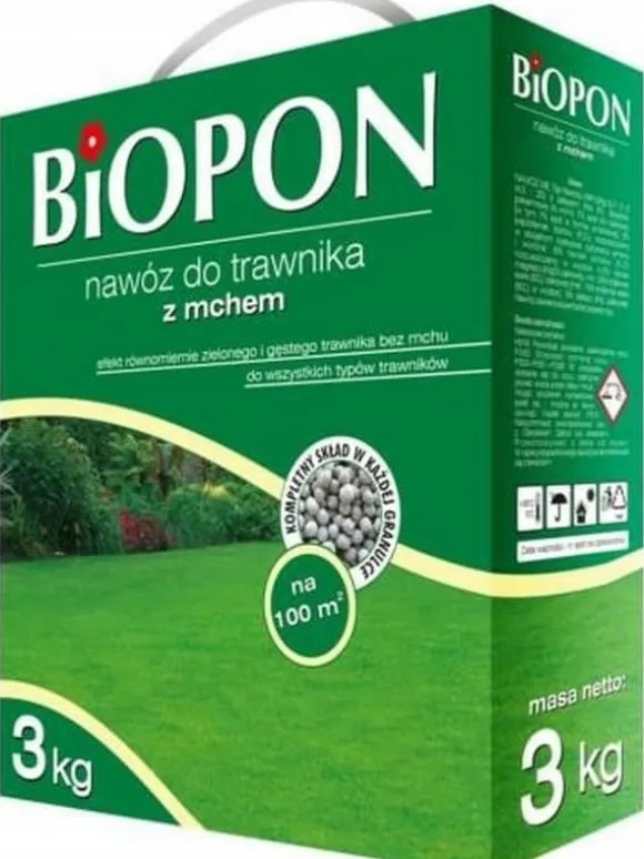 Tekniska data: Täckning: 100 m2 Enhetsförpackning: 3 kg låda med handtag BIOPON FÖR GRÄSMATTA MED MOSS Modernt flerkomponentsgödselmedel avsett för gräsmattevård. Den noggrant utvecklade sammansättningen säkerställer korrekt grästillväxt , täthet och frodig grönska. Ökat järninnehåll främjar inte tillväxten av mossa och förhindrar att den sprids. Kvävet i gödningsmedlet påskyndar gräsväxt i tomma utrymmen. KVÄVE 7 %, FOSFOR 5 %, KALIUM 8 %, MAGNESIUM 4,5 %, SVAVEL 20 %, JÄRN 5 % **