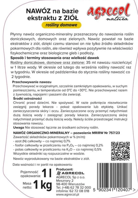 Produktparametrar Nettoinnehåll 1 kg Bruttovikt per enhet 1,04 kg Anges typen av fara på produktetiketten och/eller i bruksanvisningen? Nej Gödselmedel/näringsämne Flytande Avsedd användning För krukväxter Användningsperiod Året runt Adress till den enhet som introducerar produkten på marknaden Företagsnamn: agrecol sp. z o. o. gata och nummer: mesznary 2 postnummer och stad: 98-400 wieruszów pl Produkttyp Gödselmedel Kapacitet 1 l (dm³) Användning Krukväxter, krukväxter och gröna växter: späd 35 ml gödselmedel i 1 liter vatten. Från februari till september, gödsla växterna en gång i veckan. Från oktober till januari, gödsla växterna varannan vecka. Sammansättning – kväve – 0,7 % – fosfor – 0,2 % – kalium – 0,5 % Antal paket i första raden på en pall 48 samlingspaket (DU) Ursprungsland/Tillverkad i Polen