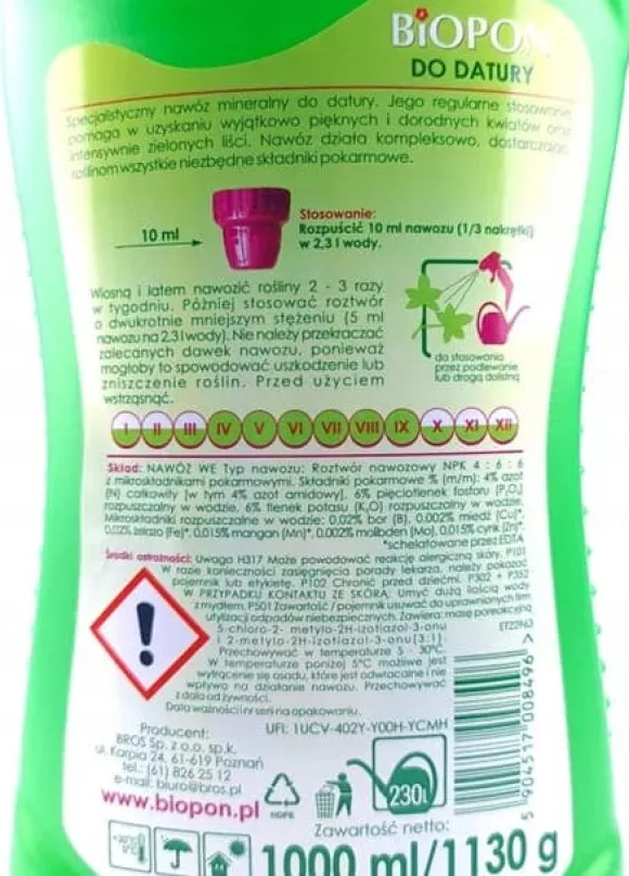 ✅ ___HtM1P14CEhO1D3R___ Märke ___HtM1P14CEhO1D3R___ : BIOPON ___HtM1P14CEhO1D3R___ ✅ ___HtM1P14CEhO1D3R___ Gödseltyp ___HtM1P14CEhO1D3R___ : Flytande, mineraliskt, koncentrerat ___HtM1P14CEhO1D3R___ ✅ ___HtM1P14CEhO1D3R___ Användningsområde ___HtM1P14CEhO1D3R___ : Spikboll (Datura, änglatrumpeter) ___HtM1P14CEhO1D3R___ ✅ ___HtM1P14CEhO1D3R___ Näringsämnen ___HtM1P14CEhO1D3R___: Kväve (N) – 4 %, Fosfor (P₂O₅) – 6 %, Kalium (K₂O) – 6 % ___HtM1P14CEhO1D3R___ ✅ ___HtM1P14CEhO1D3R___ Kapacitet ___HtM1P14CEhO1D3R___: 1 l ___HtM1P14CEhO1D3R___ ✅ ___HtM1P14CEhO1D3R___ Verkningsgrad ___HtM1P14CEhO1D3R___: 1 förpackning = 200 liter gödningslösning ___HtM1P14CEhO1D3R___ ✅ ___HtM1P14CEhO1D3R___ Bruksanvisning ___HtM1P14CEhO1D3R___: Lös upp 5 ml gödselmedel i 1 liter vatten. Använd för daglig vattning från vår till höst (april – september) ___HtM1P14CEhO1D3R___ Säkerhetsinformation: ___HtM1P14CEhO1D3R___ ✅ ___HtM1P14CEhO1D3R___ Läs instruktionerna på etiketten före användning ___HtM1P14CEhO1D3R___ . ___HtM1P14CEhO1D3R___ ✅ ___HtM1P14CEhO1D3R___ Undvik kontakt med livsmedel och förvaras utom räckhåll för barn ___HtM1P14CEhO1D3R___ . ___HtM1P14CEhO1D3R___ ✅ ___HtM1P14CEhO1D3R___ Överskrid inte de rekommenderade doserna. ___HtM1P14CEhO1D3R___ – för mycket gödsel kan skada växter. ___HtM1P14CEhO1D3R___ ✅ ___HtM1P14CEhO1D3R___ Förvaras torrt och svalt. ___HtM1P14CEhO1D3R___ . ___HtM1P14CEhO1D3R___