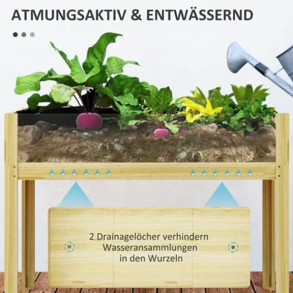 – Effektivt dräneringssystem: Denna höga rabatt i trä är utrustad med två dräneringshål och ett svart tygfoder, vilket ger denna planteringslåda optimal vattenavrinning. På så sätt förebyggs enkelt rotröta