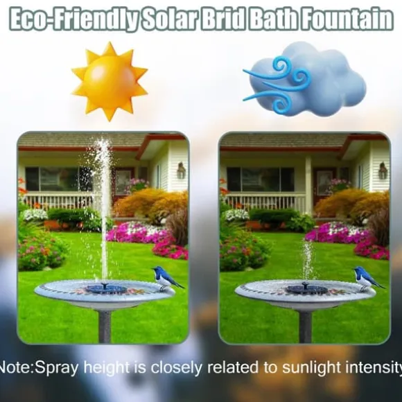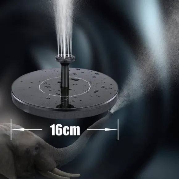 Solcellsdriven: Fontänen drivs av solceller och kräver därför inga batterier eller elektricitet. Fontänen behöver bara några sekunder av direkt solljus för att börja fungera. Den sprayar ungefär 10 – 20 cm upp i luften beroende på hur starkt solljus som ligger på den.