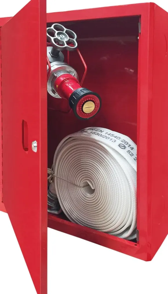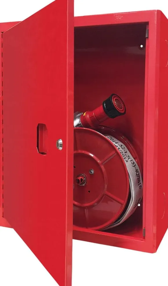 Den vägghängda interna brandposten med flatslang finns i två slanglängder: 15 m och 20 m. Tillverkad av svart stålplåt har den en rulle med en 52 mm halvstyv slang, ett 52 mm munstycke med motsvarande 12 mm munstycke, en vattenaxel i galvaniserad mässing, en 0,8 m matningsslang och en mässingsventil DN 52. Den interna brandposten möjliggör vattenförsörjning åt vänster och höger. Den har ett patenterat lås med ett ”krossat glas”-system och en hel dörr som kan vändas. Setet innehåller dokumentation: säkerhetsskylten ”Intern brandpost”, en bruksanvisning, en typskylt och tillverkarens försäkran om överensstämmelse med ett garantikort. Brandposten uppfyller kraven i standarden EN671-1. Välj lämplig slanglängd och skydda dina lokaler från brand.