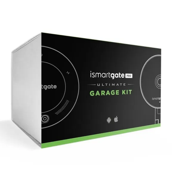 Inkluderar ismartgate PRO-enheten, vattentät trådlös garageportsensor och trådlös inomhus IP-kamera med mörkerseende.
