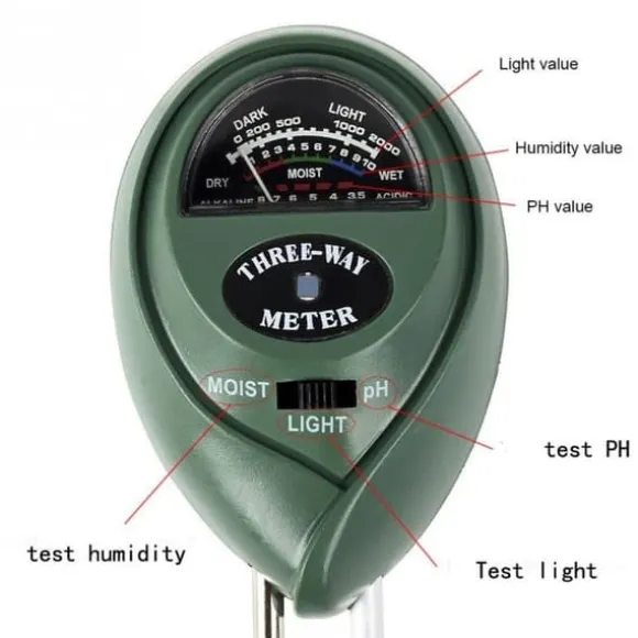 – Mäter fuktighet, ljus, och pH-värde i jorden