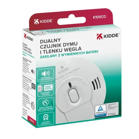 K10SCOär en dubbel rök- och kolmonoxiddetektor utrustad med ett röstlarm och två oberoende sensorer. Den optiska sensorn detekterar brandlarm, medan den elektrokemiska sensorn detekterar kolmonoxid (CO).