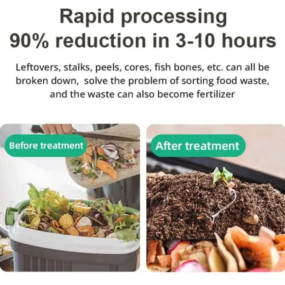 Snabb omvandling Kompostern accelererar torkning och nedbrytning så att organiskt avfall blir jordlikt och mindre illaluktande inom timmar – utmärkt för krukväxter eller vidare kompostering.