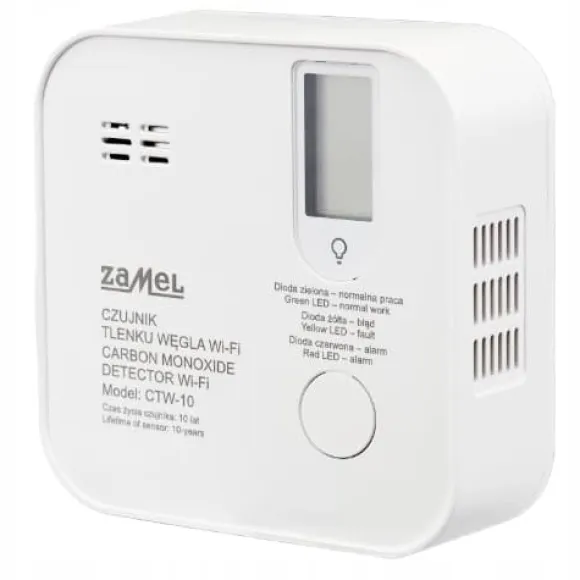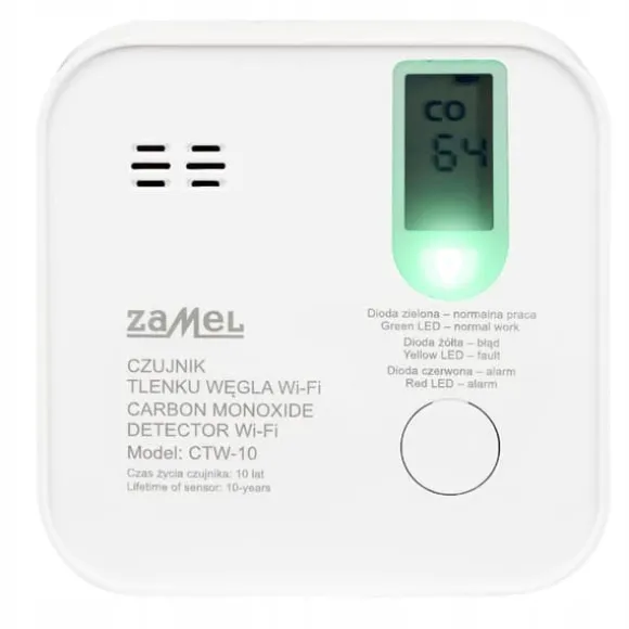 DeCTW-10sensor används för att kontinuerligt övervaka farliga koncentrationer avkolmonoxidi luften. När ett hot upptäcks utlöser sensorn en hög ljudsignal(min.85 dB) och en blinkande LED. Den är utrustad med en exakt och pålitligelektrokemisk sensormed en livslängd på10 år. Sensorn kan fungera oberoende, men tack vare den inbyggdaWi-FiochgratisTUYA app du kan fjärråtkomst till sensorn på telefoner och surfplattor som körsAndroidelleriOS. Det betyder att om ett larm uppstår kommer användaren att få ett meddelande på sin telefon även om de är borta från sensorns installationsplats, till exempel på jobbet eller på semester på andra sidan jorden (telefonen måste ha en internetuppkoppling). Produktens funktionella egenskaper: