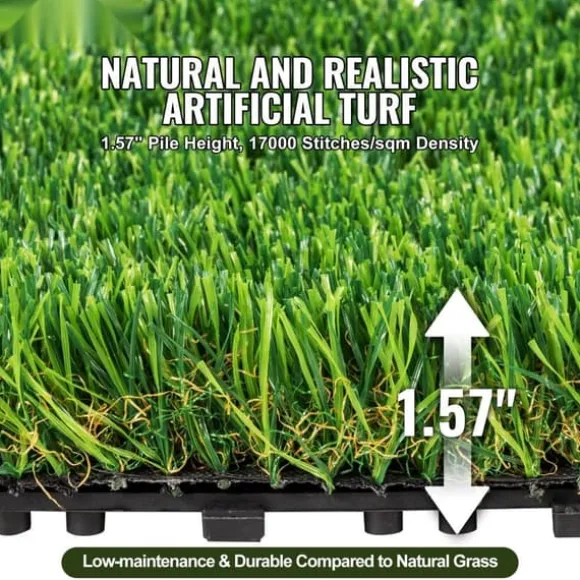 Högdensitets gräsfibrer: Vår konstgräs har en design med fyrfärgade högdensitets gräsfibrer som imiterar de naturliga färgvariationerna av äkta gräs och ger ditt utrymme en fräsch grön känsla. Med en gräshöjd på 4 cm och en densitet på 17 000 stygn erbjuder det en mjuk och behaglig yta.