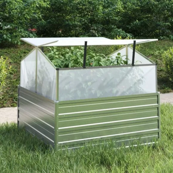 Odlingslådan är djup och bred nog att förvara en stor mängd jord och har gott om plats för dina växter, grönsaker, örter och blommor. Eftersom den är tillverkad i kraftigt galvaniserat stål är odlingslådan väderbeständig och därmed väldigt praktisk för utomhusbruk. Växthuset erbjuder värme och skydd för dina plantor och har ett tak som går att öppna.