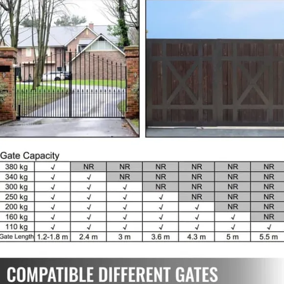 Vår enskilda portöppnare är kompatibel med både push- och pull-öppning. Perfekt för alla typer av portar, inklusive kedjelänk-, rör-, panel-, vinyl- och träportar. Den är designad för portar upp till 5,5 m långa och med en vikt på upp till 380 kg.