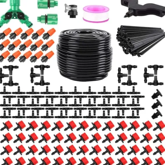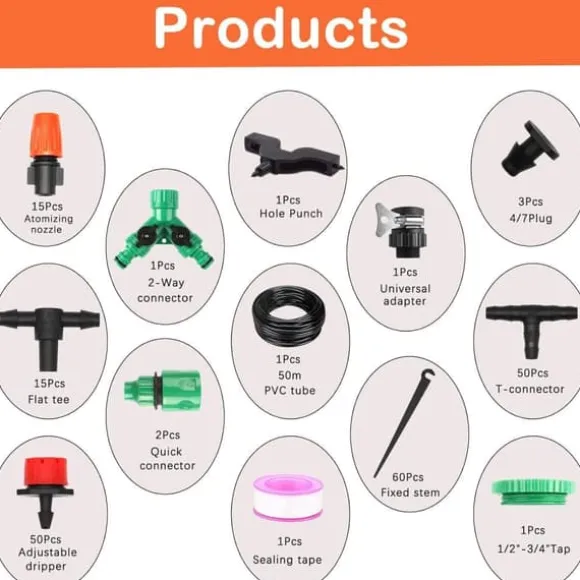 50 meter PVC-slang, 1 st 1/2”-3/4” krananslutning, 1 st tvåvägsanslutning, 1 st universaladapter, 2 st snabbkopplingar, 50 st T-kopplingar, 15 st raka trevägskopplingar, 3 st 4/7 pluggar, 60 st fixeringspinnar, 50 st justerbara droppmunstycken, 15 st dimmunstycken, 1 st håltagare, 1 rulle tätningsband.