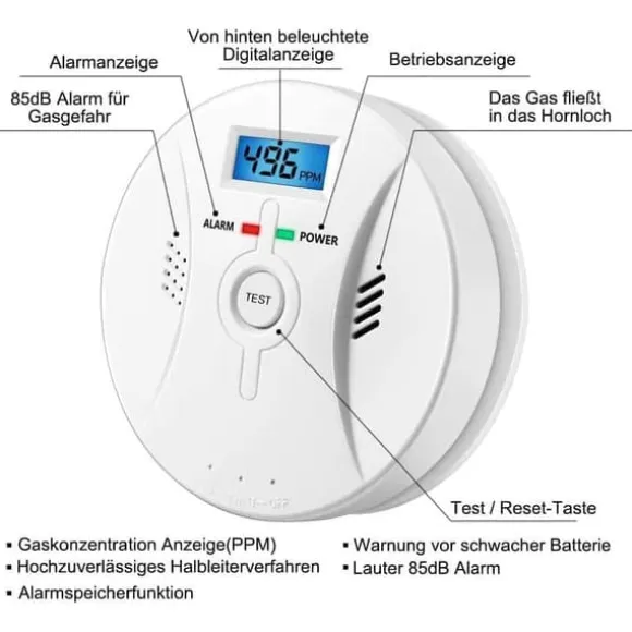 Denna detektor är utrustad med en högkänslig sensor som kontinuerligt övervakar kolmonoxidkoncentrationen i miljön. När koncentrationen överstiger säkerhetsgränsen avger enheten en hög ljudsignal tillsammans med blinkande LED-lampa för att snabbt varna dig och säkerställa din och familjens trygghet.