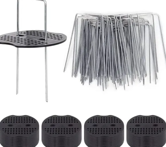 Detta set med 50 markspikar och 50 buffertskivor är tillverkat av rostfritt stål med galvaniserad yta för att motstå rost. Spikarna i U-form, med dimensionerna 100 mm x 40 mm och 3 mm i diameter, är utformade för att hålla material som växthusdukar, skuggnät eller konstgräs på plats under olika väderförhållanden.