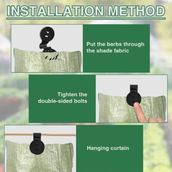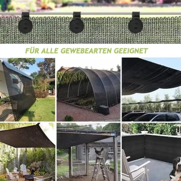 Klämmorna används för att fästa skuggnät, fågelskyddsnät, växthusdukar eller jordbruksnät. De är lämpliga för trädgårdar, terrasser, växthus eller odlingsområden och bidrar till att skydda växter från sol, vind eller fåglar samt skapa en skuggad miljö för odling eller avkoppling.