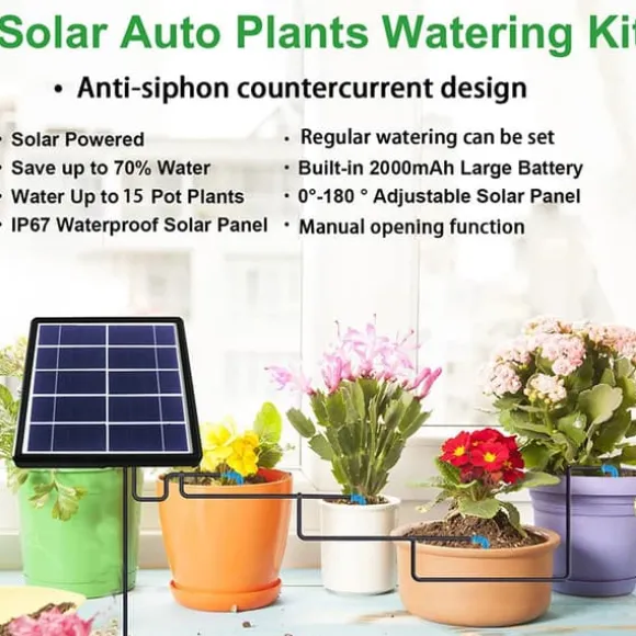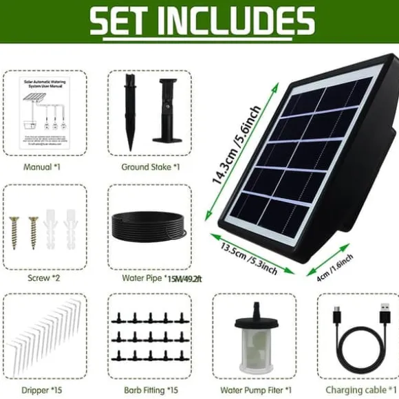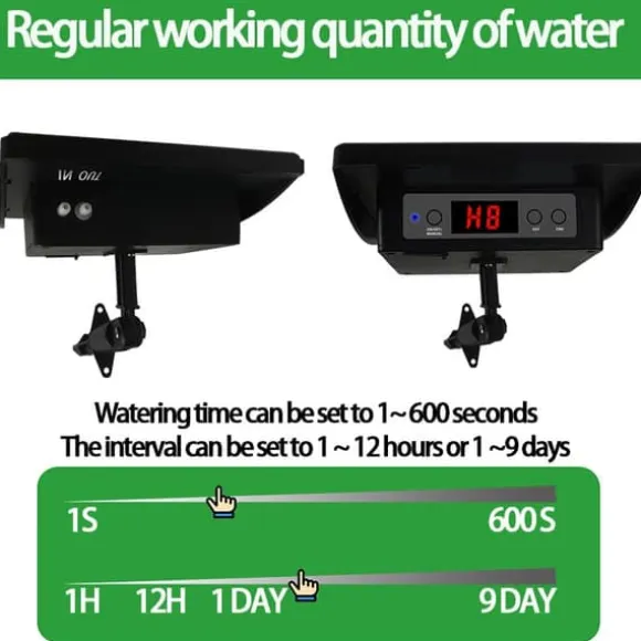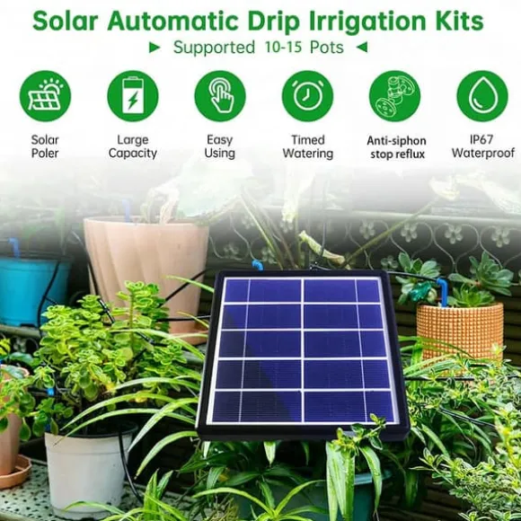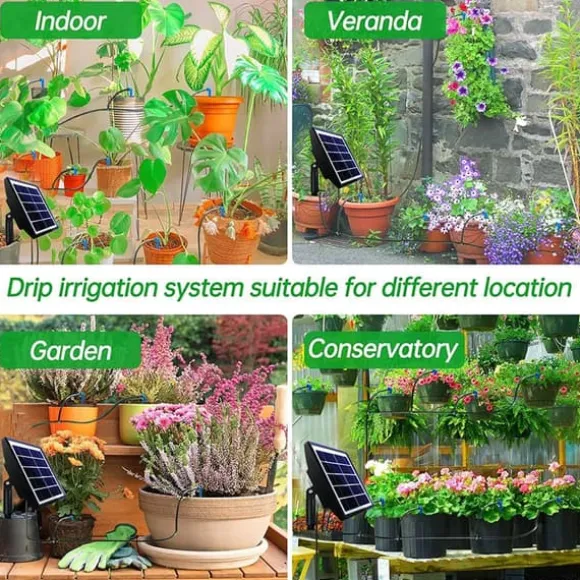 Denna enhet drivs av solenergi och kan hämta vatten direkt från behållare som hinkar, utan behov av vattenkran. Den vattnar automatiskt dina växter med förinställda intervaller och mängder, och ger ett larm om pumpen går torr eller om vattennivån är låg. Perfekt för balkonger, uteplatser och små trädgårdar utan kran och fast eluttag.