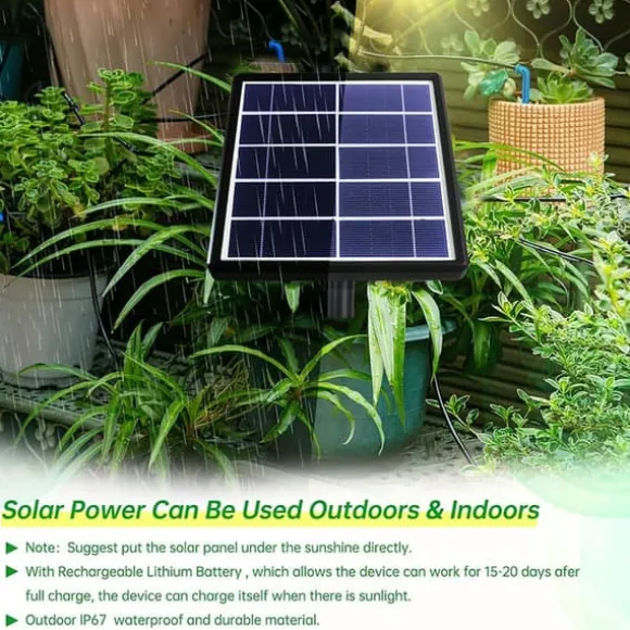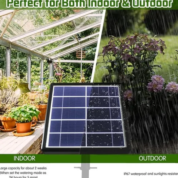 Bevattningssystemet är tillverkat av IP67-vattentätt och UV-beständigt material, vilket gör det lämpligt för både inomhus- och utomhusbruk. Placera solpanelen i direkt solljus och se till att sidan med strömbrytaren är vänd nedåt. Produkten kan sättas i jorden med markspett eller monteras på väggar, staket m.m. med skruvar.