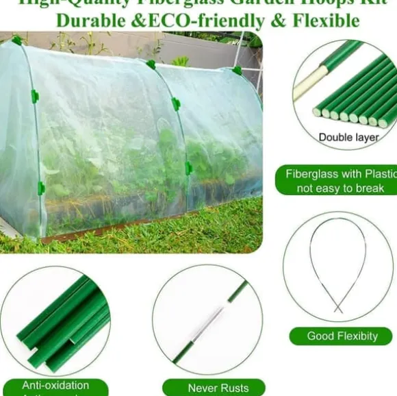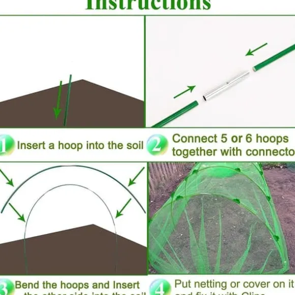 Enkel installation: Sätt bara ner bågarna i jorden och använd kopplingar för att sammanfoga 5 eller fler bågar. Böj bågarna och tryck ner den andra änden i jorden, fäst sedan täckmaterialet med klämmor. Setet är lämpligt för radtäckning, upphöjda bäddar, grönsaksland och vinodlingar för att skydda växterna mot djur.