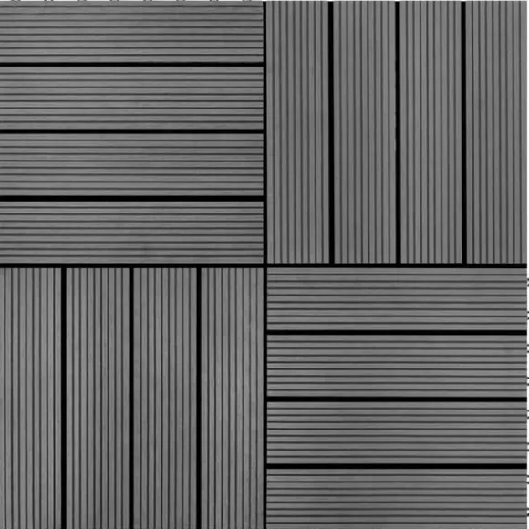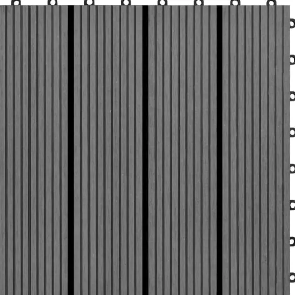Denna uppsättning markplattor i plast- och träkomposit, vardera i en storlek på 30 x 30 cm, levereras komplett med 11 stycken, vilka tillsammans täcker 1 kvadratmeter. De är perfekta för uteplatser, balkonger, badrum eller platser nära pooler och span.