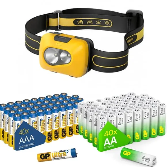 Nödlägesberedd strömförsörjningssats: Detta allt-i-ett-kit innehåller en tålig LED-pannlampa, 40 AA GP Extra-batterier och 40 AAA GP Ultra Plus-batterier – perfekt för nödutrustning, strömavbrott och utomhusaktiviteter.