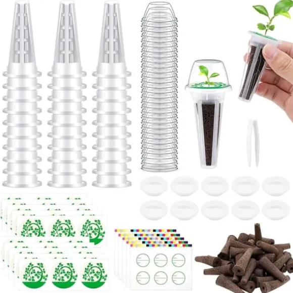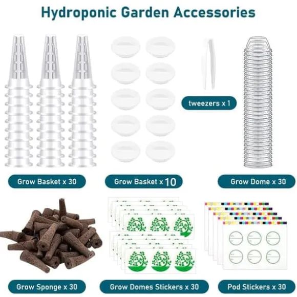 Detta set innehåller allt du behöver för ditt inomhusodlingssystem: 30 odlingssvampar, 30 odlingskorgar, 60 etiketter, 30 odlingskupoler, 10 hålskydd och 1 pincett – totalt 161 delar. (Observera: Frön ingår ej.)