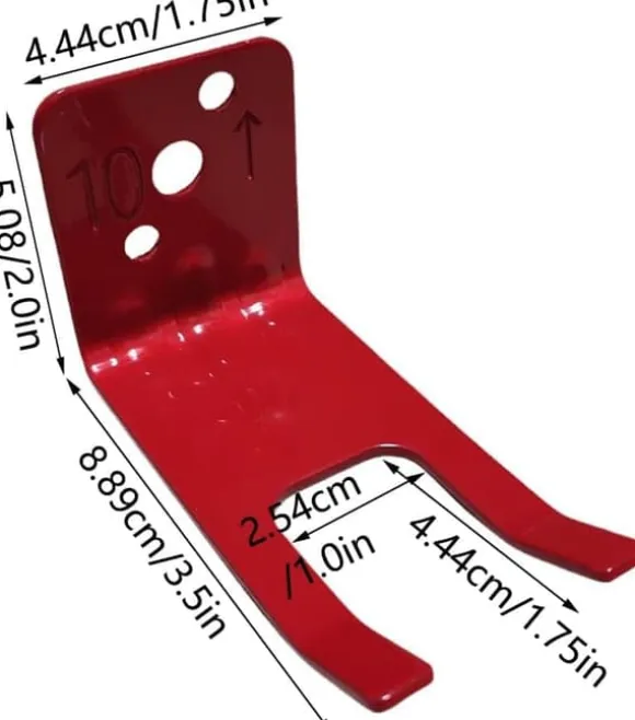3. Vägghållaren i metall med måtten 4,44*5,08*8,89 cm/1,75*2,0*3,5 tum tar inte upp för mycket plats på väggen och springans storlek är 2,54*4,44 cm/1,0*1,75 tum. Vertikal montering och lätt böjda krokkäftar håller brandsläckaren på plats och förhindrar att den rör sig eller faller. Den röda ytan matchar brandsläckarens färg med en naturlig, mycket fin färg som inte sticker ut.