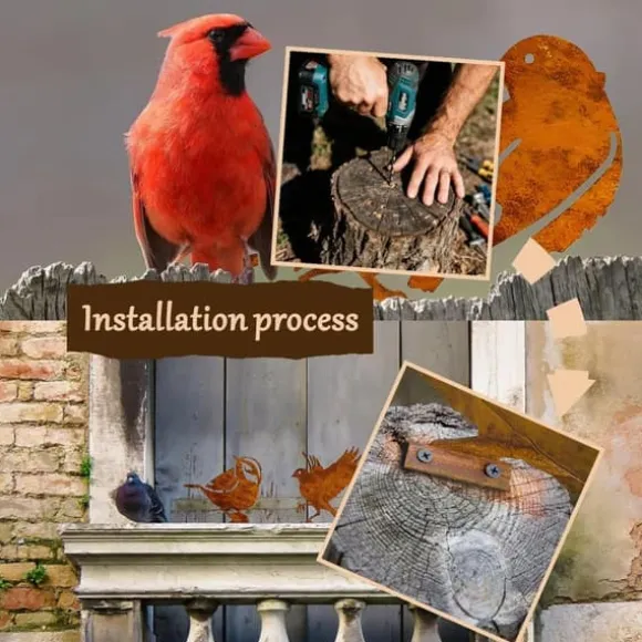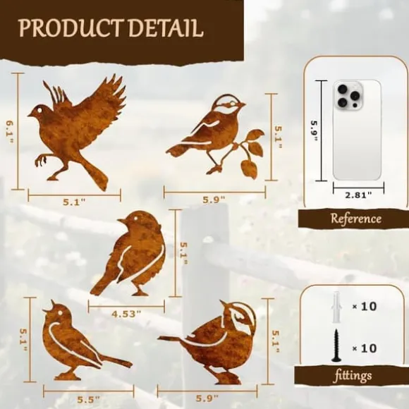 ✔ Enkel att montera – Varje fågel har förborrade hål och medföljande skruvar för snabb och enkel installation. Fäst dem på fönsterbrädor, staket, grenar, trädgårdsgrindar, stockar eller andra utomhusytor. Oändliga möjligheter för dekoration med metallfåglar i trädgården!