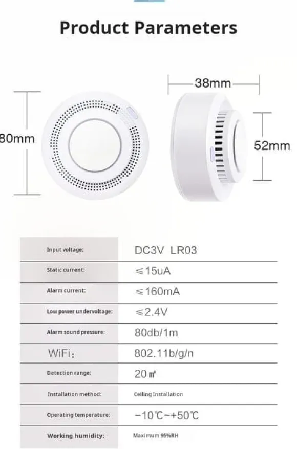 Anslut rökdetektorn till appen Tuya Smart eller Smart Life. Du får direktmeddelanden i mobilen vid rökdetektion, fel, eller låg batterinivå. (Obs: endast 2,4 GHz WiFi stöds – ej 5G).