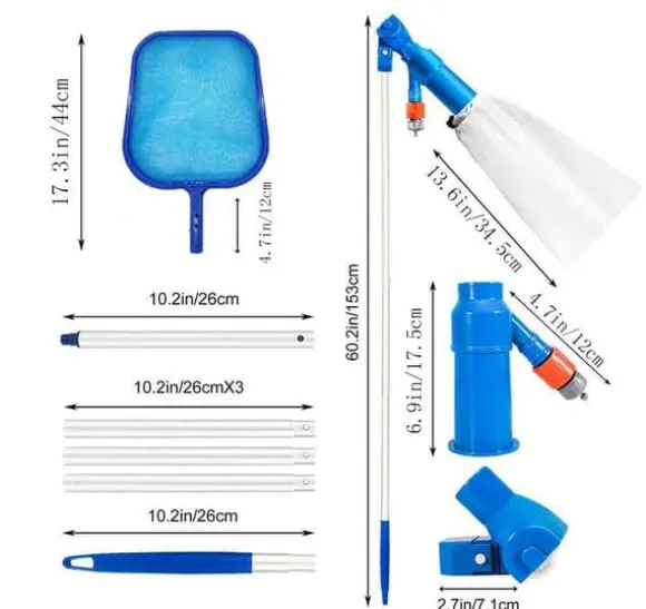 【Handhållen pooldammsugare med filterpåse】Denna manuella pooldammsugare kräver ingen ström – den drivs helt av vattentryck. Den avlägsnar snabbt och effektivt löv, sand och skräp, vilket gör den idealisk för pooler, spabad och bubbelpooler.
