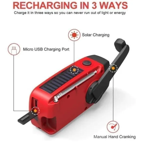 Kraftig vevradio som du ladda via solpanelen, va micro USB-uttaget eller med hjälp av den inbyggda veven. Mobilen kan laddas.