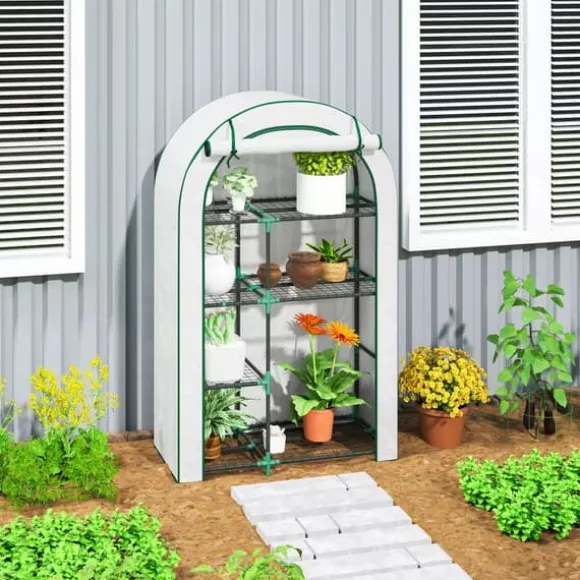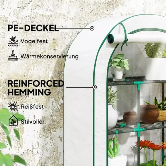 Detta växthus från Outsunny har en design med fyra nivåer som ger gott om utrymme för blomkrukor och sålådor, allt skyddat av ett 140g/m² tjockt plastskydd som skyddar mot UV-strålar och släpper igenom rikligt med solljus. Tomathusets upprullningsbara dörr med dragkedja ger enkel åtkomst och säkerställer optimal ventilation. Perfekt för entusiaster av små växthus som vill ha en mobil trädgårds-oas!