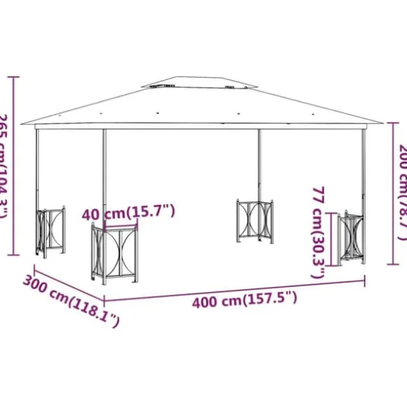 - Premium material: Denna trädgårdspaviljong är konstruerad med en pulverlackerad stålram. Därför är den väldigt stabil och hållbar. Taket är tillverkat av 100% polyester med PA-beläggning som är vattenbeständigt och kan hindra de mest skadliga solstrålarna.