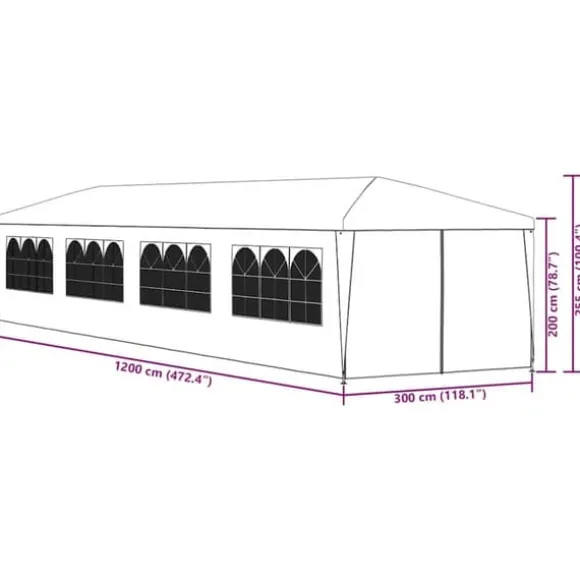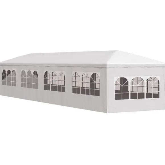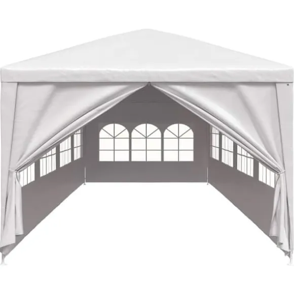Partytältet är tillverkat i 100% polyetenmaterial och är UV-resistent och vattenbeständigt. Det har 8 avtagbara sidopaneler, vardera med dekorativa fönster och 2 dörrpaneler med dragkedjor för enkel ingång. Denna ram är tillverkad av rostbeständigt stål och är därför mycket hållbart. Monteringen är enkel.