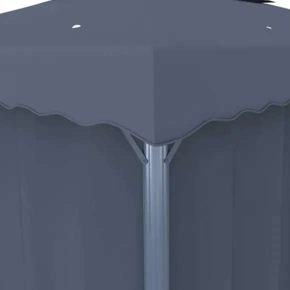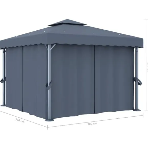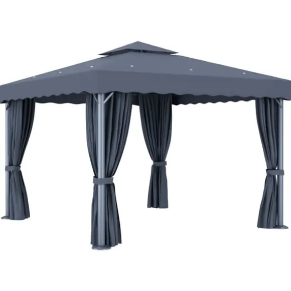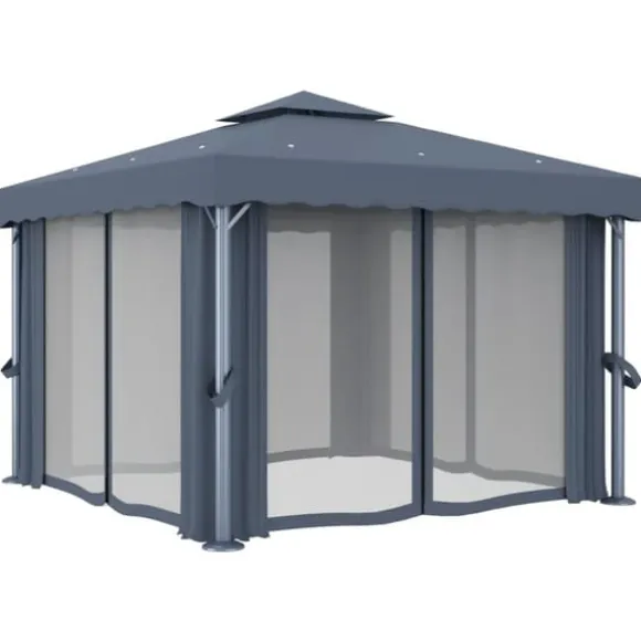 Den är utformad för att ge dig en sval plats för trädgårdsfester, familjepicknickar, grillfester och andra sammankomster. Den är tillverkad med aluminiumstolpar och stödstänger i pulverlackerat stål som säkerställer överlägsen stadighet och hållbarhet. Taket och sidoväggarna är tillverkade i högkvalitativt polyestertyg med PA-beläggning som skyddar dig mot skadliga solstrålar och lätt regn. Ett väldesignat tak i 2 våningar säkerställer bra luftflöde undertill. Dessutom ingår draperier och nätskärmar som ger dig insynsskydd samtidigt som det skyddar mot störiga myggor och andra insekter. Fästen med kardborreband ingår för enkel fastsättning. Dessutom skapar ljusslingan en mysig atmosfär i din trädgård när solen går ner. Ljusslingan förorenar inte miljön eftersom den laddas av solenergi under dagen.