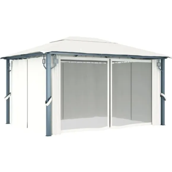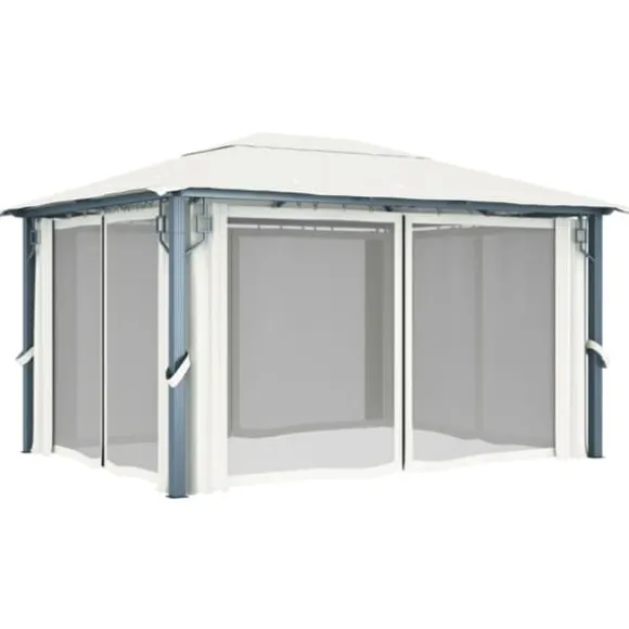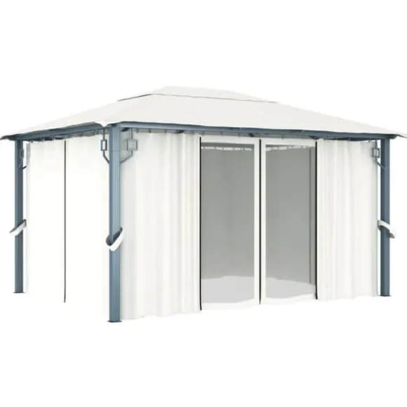 Taket, tillverkat i oxfordtyg med PA-beläggning, skyddar dig mot skadliga UV-strålar i direkt solljus. Paviljongen är massivt tillverkad av stark aluminium och starkt stål och är därför resistent mot rost och mycket stabil. Paviljongen levereras med 4 sidoväggar som kan användas vid dåligt väder. Nätskärmar ingår också för att hålla insekter borta men samtidigt låta luften cirkulera. Kardborrefästen ingår också för enkel fastsättning av draperierna.