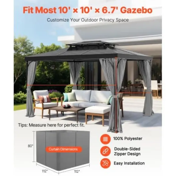 Förbättra din utomhusmiljö med dessa hållbara paviljonggardiner, designade för att ge avskildhet och skydd mot väder och vind. Tillverkade av högkvalitativt vattentätt polyester, har dessa gardiner dubbelsidiga dragkedjor för enkel åtkomst och säkra aluminiumöljetter för smidig montering. Perfekta för altantak, de skapar en bekväm och privat miljö för avkoppling eller umgänge utomhus.