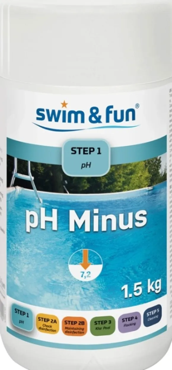 Granulat som sänker poolvattens pH värdet. Idealt pH värde: 7,0-7,4. Inom dette interval fungerar Swim & Fun sköttsmedel optimalt. Om pH-värdet är mer än 7,4 skall det sänkas med pH Minus. Om pH värdet ligger under 7,0 skall det höjas med pH Plus. PH Värdet är lätt att mäta med Swim & Fun testremsor.