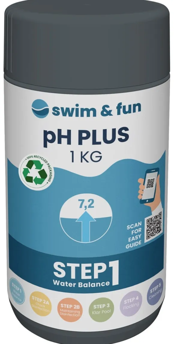 PH-Plus granulat 1 kg. Levereras i en praktisk plastbehållare med ett barnsäkert lock. Behållaren är märkt med detaljerade instruktioner på de nordiska språken samt engelska.