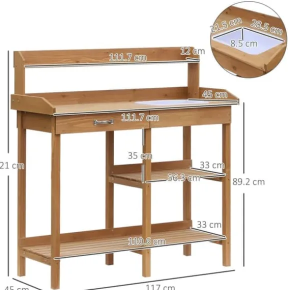 – PRODUKTDATA: Totala mått: B117 x D45 x H121 cm, arbetshöjd: 89,2 cm, mått på lådan: B50,8 x D40 x H10 cm, innermått på tråget: B28,5 x D21,5 x H8,5 cm.