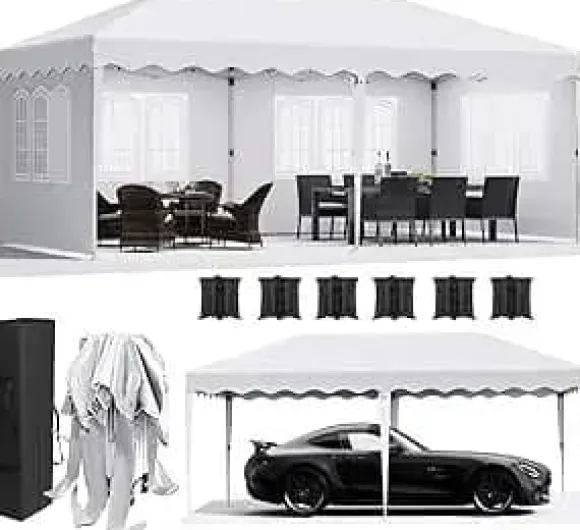 Pop-up paviljong 3 x 6 m i vittDenna rymliga paviljong i vitt fälls upp på några minuter med ett centralt lås-system och ger pålitligt skydd för trädgård, uteplats, marknader och fest. Det vattentäta, PU-belagda 420D Oxfordtaket med UPF 50+ kombineras med en lätt men robust aluminiumram och avtagbara sidoväggar med fönster för flexibel användning.