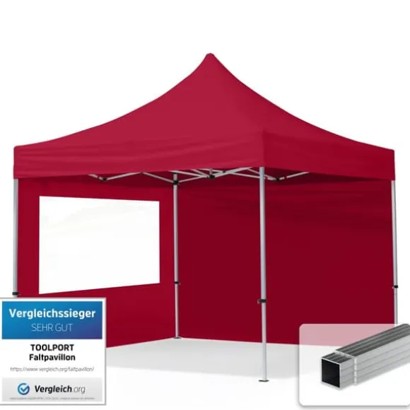 Detta högkvalitativa snabbtält är perfekt för bärbar användning. Tack vare ett extra lätt aluminiumstativ kan det enkelt transporteras i medföljande transportväska. För en högre stabilitet har aluminiumet blivit anodiserat, vilket gör det 15 gånger starkare än vanligt aluminiummaterial. Benen har en robust kvadratisk profil med en diameter på ca. 32 mm och en godstjocklek på ca. 1 mm. Takkonstruktionen är ansluten vid anslutningspunkterna med ett stabilt nylonmaterial och är hopskruvat – alla delar är därmed utbytbara. Saxmekanismen, som snabbtältet fälls upp med, möjliggör en snabb montering samt demontering av produkten och fixeras genom ett klicksystem. Takduken av PVC-belagd högpresterande polyester. Draghållfasthet av duken, 700 N*. Detta snabbtält kan justeras i 5 lägen på höjden och levereras med en stabil transportväska.