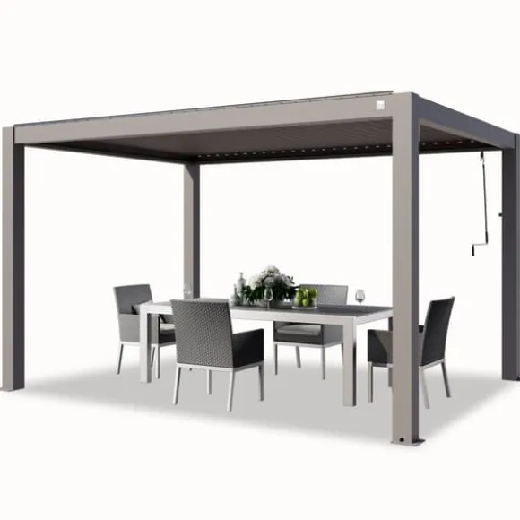 Robusthet möter elegans med denna lyxiga pergola. Den rostfria och extremt solida aluminiumkonstruktionen skyddar mot väder och vind året runt. Tack vare det praktiska vevhandtaget kan taklamellerna justeras flexibelt när som helst – utan att mekanismen är synlig. En pergola med minimalistisk look som kombinerar komfort med funktionalitet – oavsett om den är fristående eller fäst vid en byggnad.