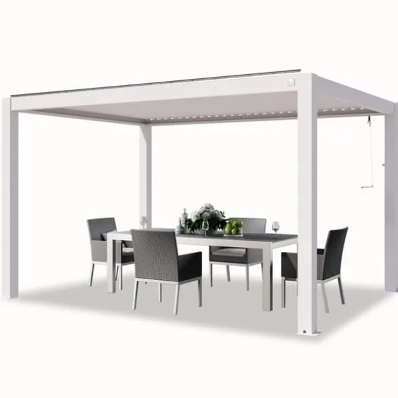 Pergolan är 100% vattentät. Ett integrerat avrinningssystem leder regnvattnet till stolparna via de invändiga rännorna. De sista regndropparna förhindras också från att droppa av genom speciella ”droppkanter”