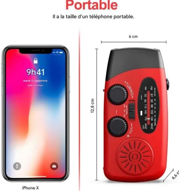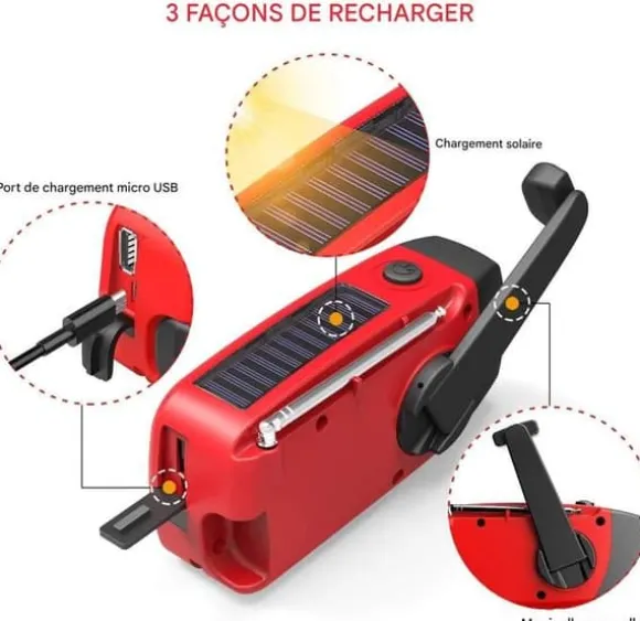 Uppladdningsbar: En USB-kabel (laddning 3-4 timmar), solpanel (laddning 10-13 timmar) eller vev;