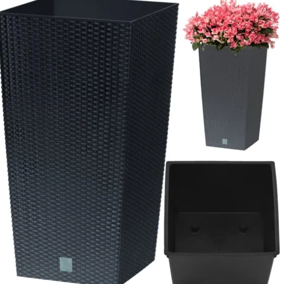 Tillverkad av plast (polypropen). Detta är en hel serie dekorativa blomkrukor med en textur som imiterar rottingvävning från Prosperplast med eleganta, klassiska former.