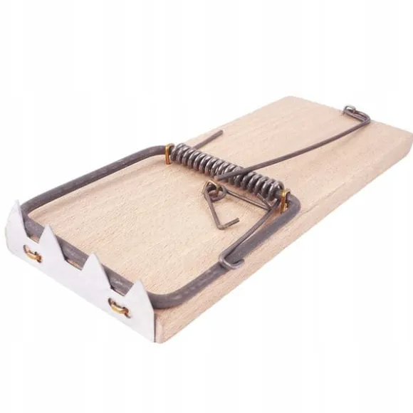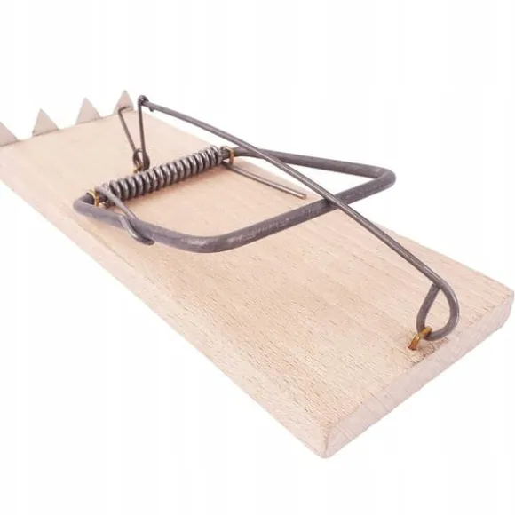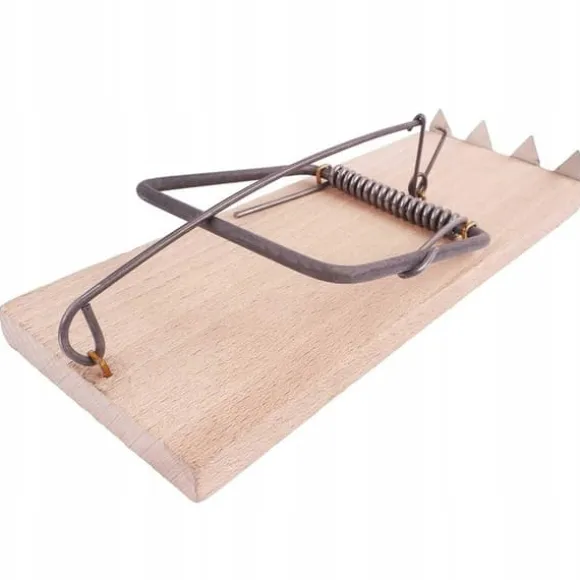 Klassisk råttfälla i trä, utrustad med en känslig låsmekanism. En solid bas och en stark fjäder kopplad till en exakt krok gör att fällan slår igen när ett försök görs att ta bort det lämnade betet, vilket dödar gnagaren omedelbart.