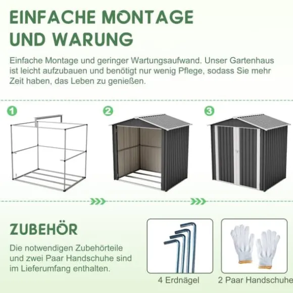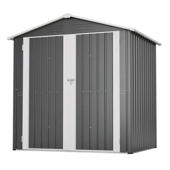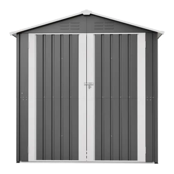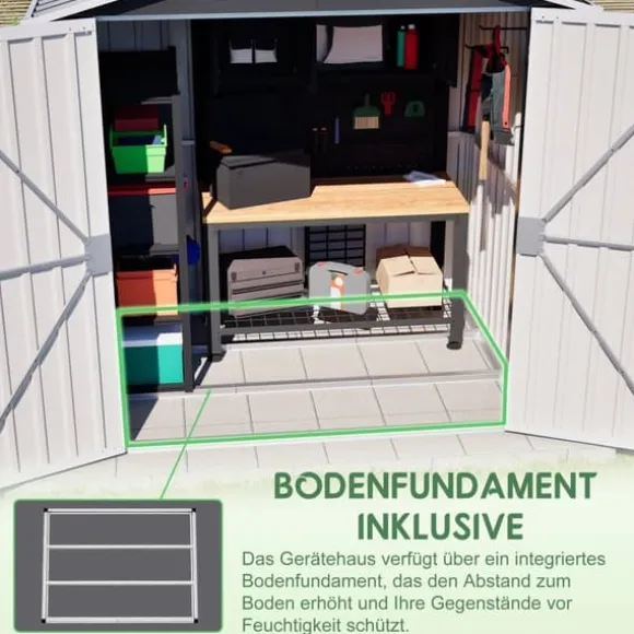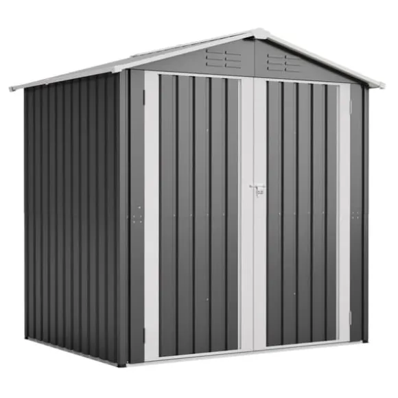 Kompakt redskapsbod i metall 185,4 × 142,3 × 185 cm (grå) med låsbar dörr, 4 ventilationsöppningar och metallfundament för torr, säker och välventilerad förvaring året runt. Ytbehandlade stålpaneler står emot väder och UV, och det medföljande fundamentet lyfter boden ca 5 cm från marken för att minska fukt. Levereras med 4 markspik och 2 arbetshandskar – smidig montering med tydlig guide.