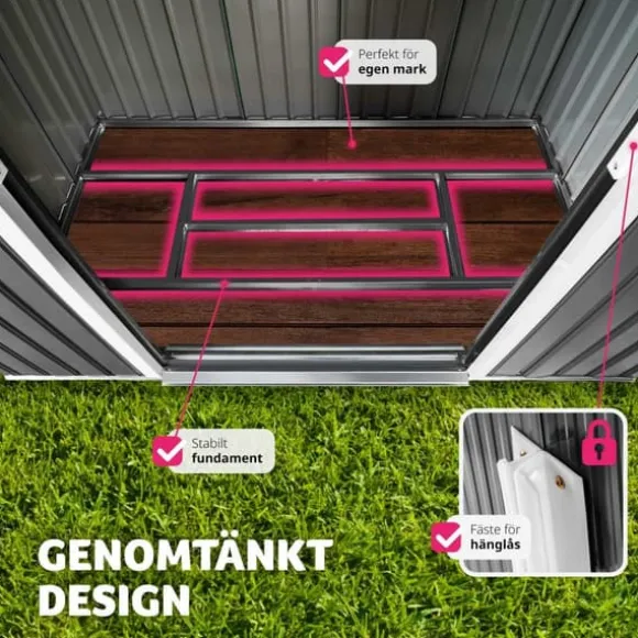 Vårt trädgårdshus är byggt på ett robust metallfundament som säkerställer maximal stabilitet och hållbarhet. Trots sina kompakta mått erbjuder det en generös förvaringsyta, vilket gör det till en idealisk lösning även för mindre trädgårdar och bakgårdar. Du kan enkelt lägga till en golvbeläggning av valfritt material inne i trädgårdshuset för att ytterligare anpassa det efter dina behov.